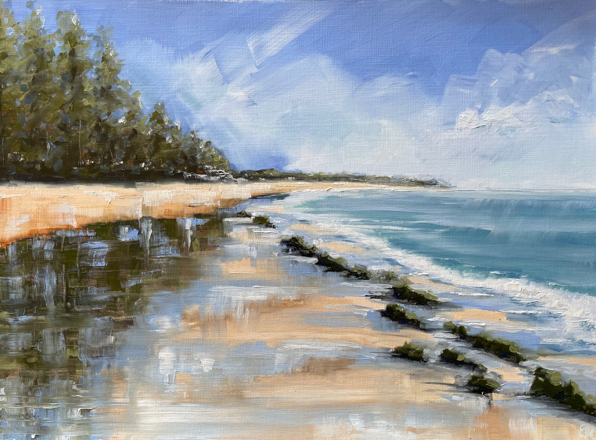 Bright blue skies and the sun is shining, reflections light the sand across the falling tide. This piece captures the essence of Terrigal with its iconic Pine trees and shining sands.